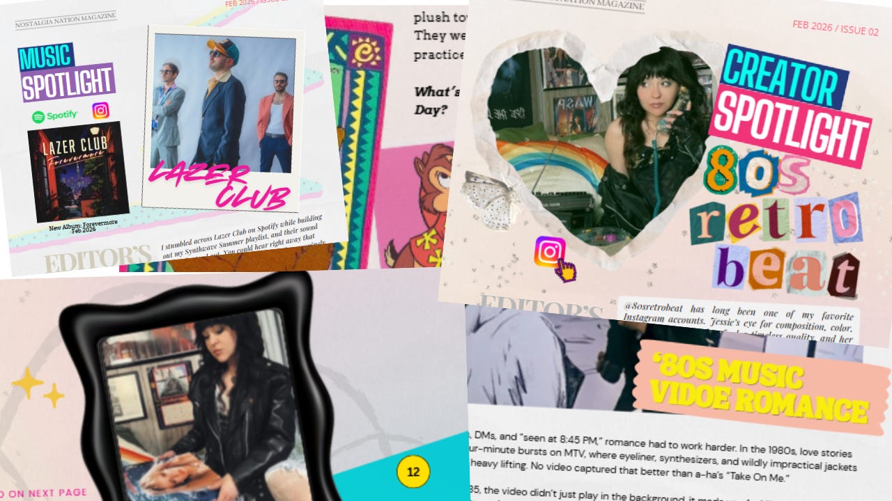 This issue leans into love, longing, and the pop-culture moments that quietly rewired us. There’s a deep-cut Music Spotlight on Lazer Club, a new Creator Spotlight starring the lovely 80sretrobeat, and a trivia section designed to separate the casual nostalgists from the real ones. It’s playful and rooted in the stuff we actually lived during the month of February.